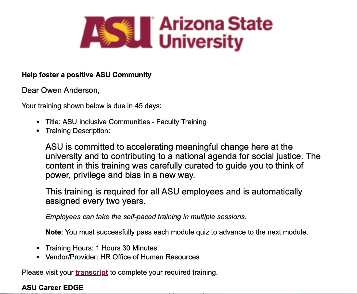When I first raised a question about ASU’s required employee training, the official response was that it did not exist. Then they admitted that yes, it exists but claimed it was not required. This email from ASU shows that it does exist, that it is required every two years, and that it is part of the university’s effort to “accelerate” change in order to contribute to a “national agenda” for “social justice.”
